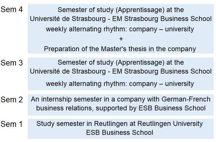 Three languages You study in three languages (German, English, French) and two countries (Germany and France) - each with an integrated practical phase.