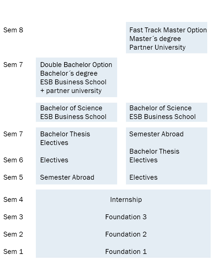 Gleich zwei Abschlüsse in 8 Semestern machen? Mit der einzigartigen "Fast Track"-Option steht Ihnen ein zusätzlicher MBA- oder Masterabschluss an einer internationalen Partnerhochschule offen.