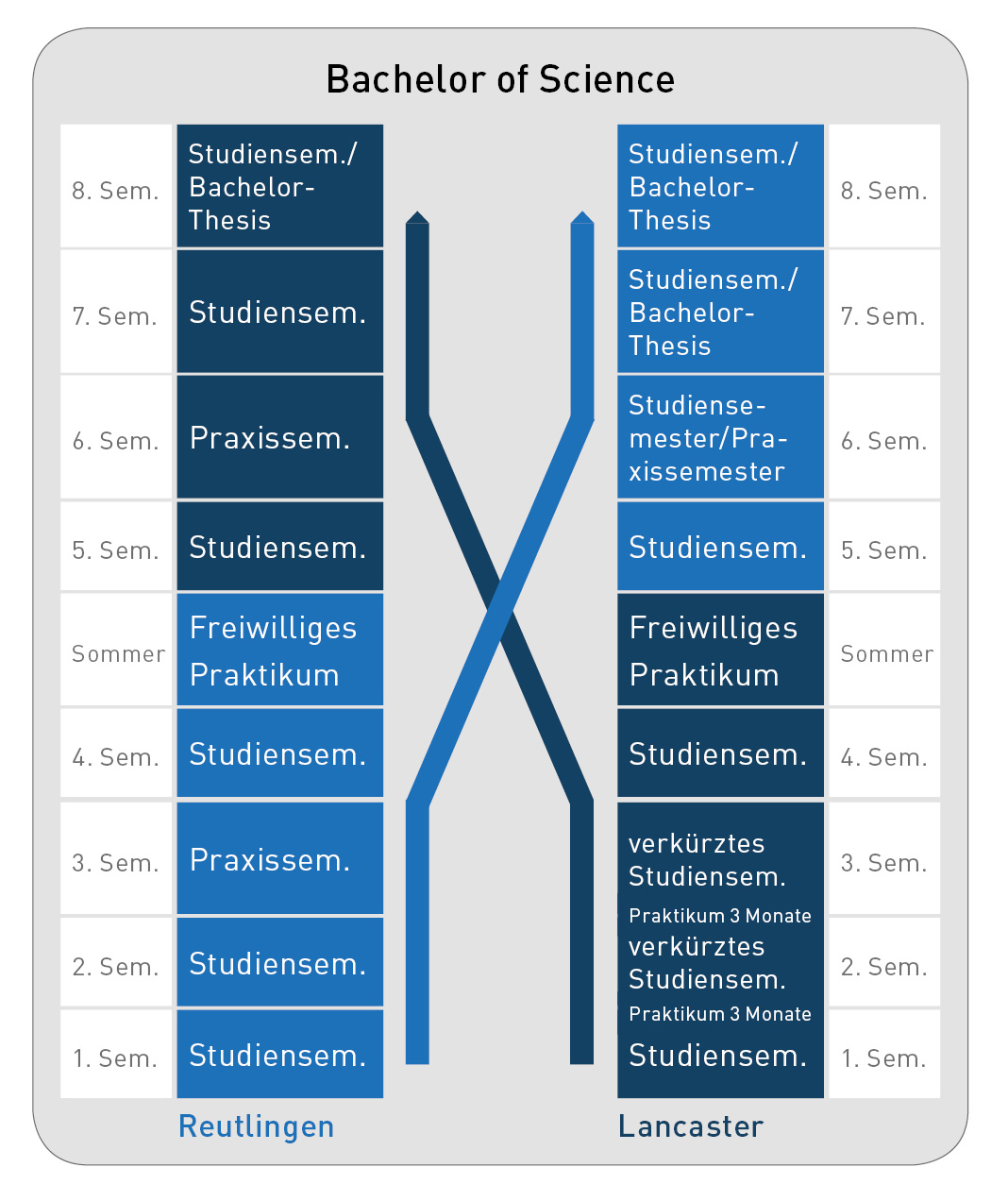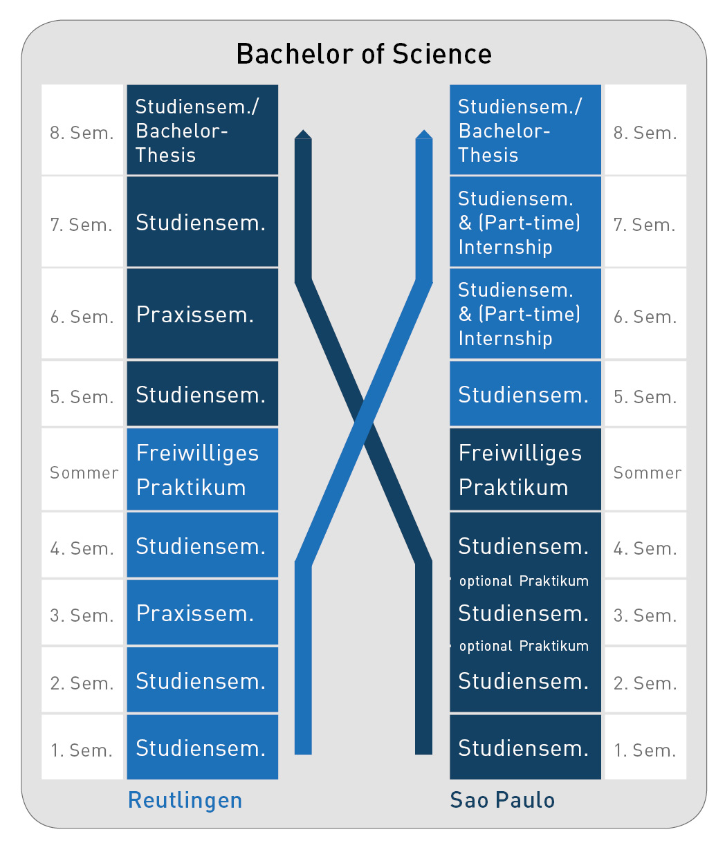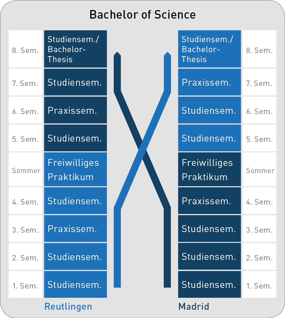 - 8 Semester (4 an der ESB, 4 an der Partneruniversität)