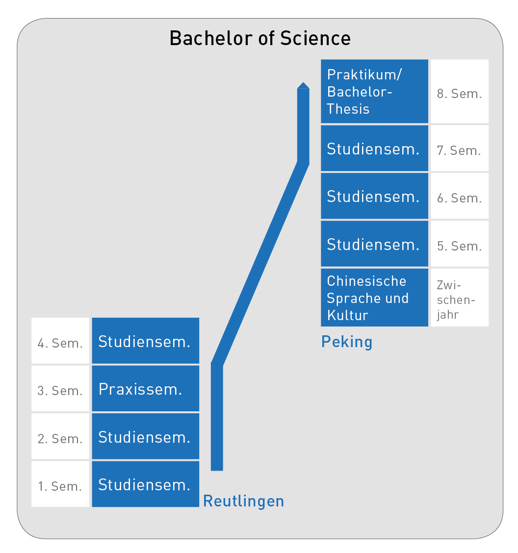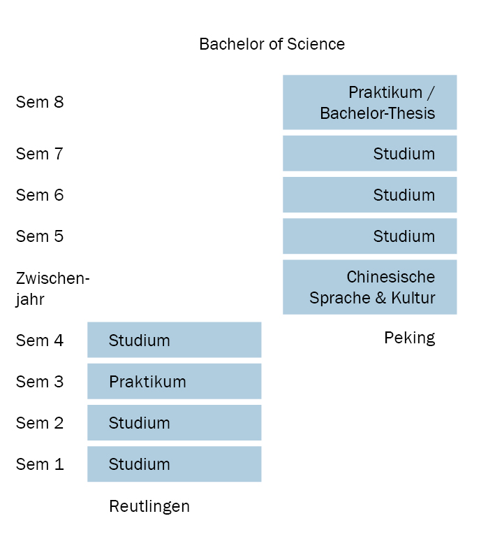 Zunächst studieren Sie zwei Jahre an der ESB Business School in Reutlingen. Mehrere Kurse in chinesischer Sprache bereiten Sie auf Ihren China-Aufenthalt vor. Im 5. Semester widmen Sie sich an der UIBE ausschließlich der chinesischen Sprache und Kultur. Falls Sie bereits ausreichende Sprachkenntnisse besitzen, können Sie das Zwischenjahr überspringen.