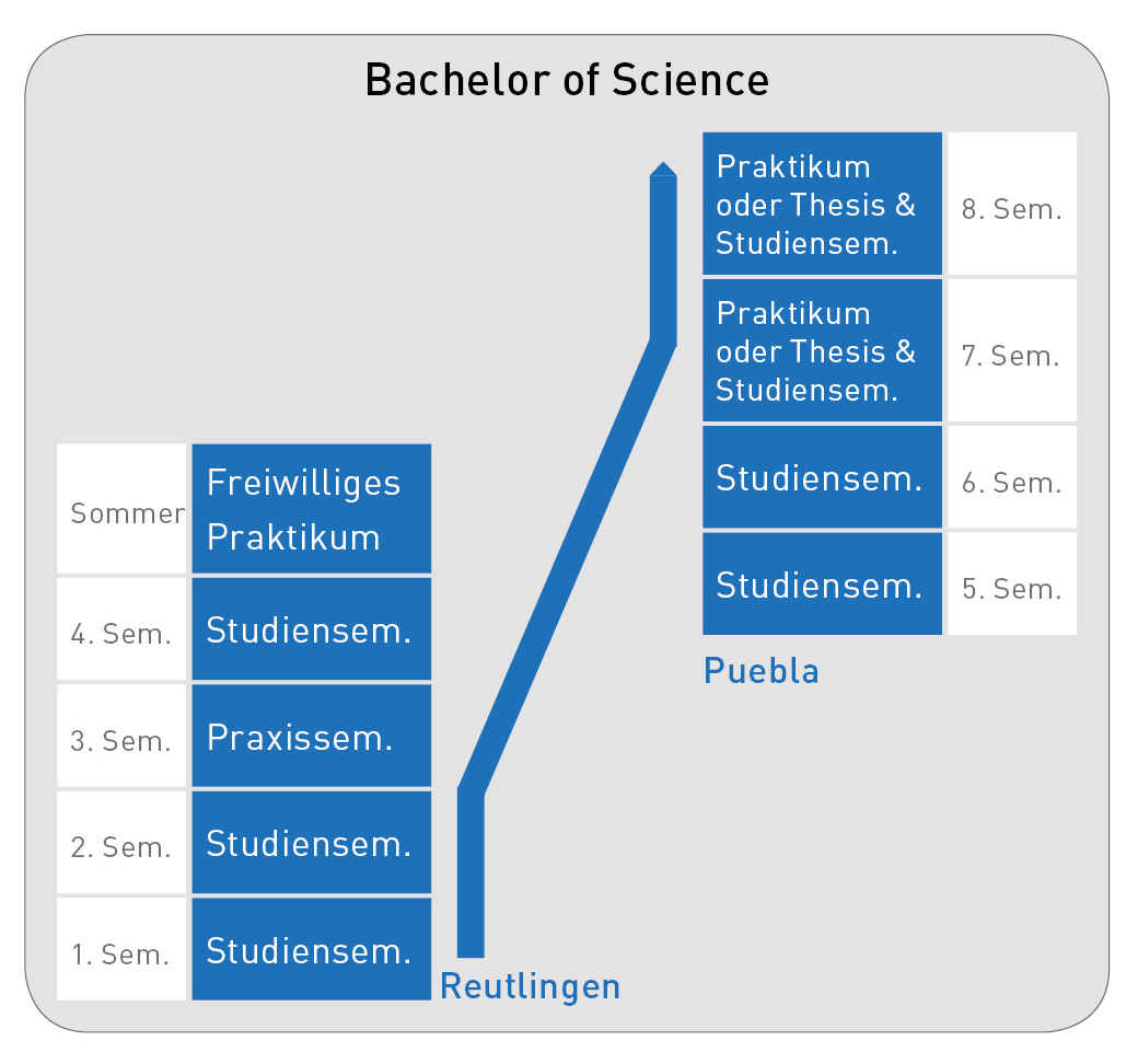 Im deutsch-mexikanischen Studiengang studieren Sie je zur Hälfte an der ESB Business School in Reutlingen und an der Universidad de las Américas Puebla (UDLAP) in Puebla.