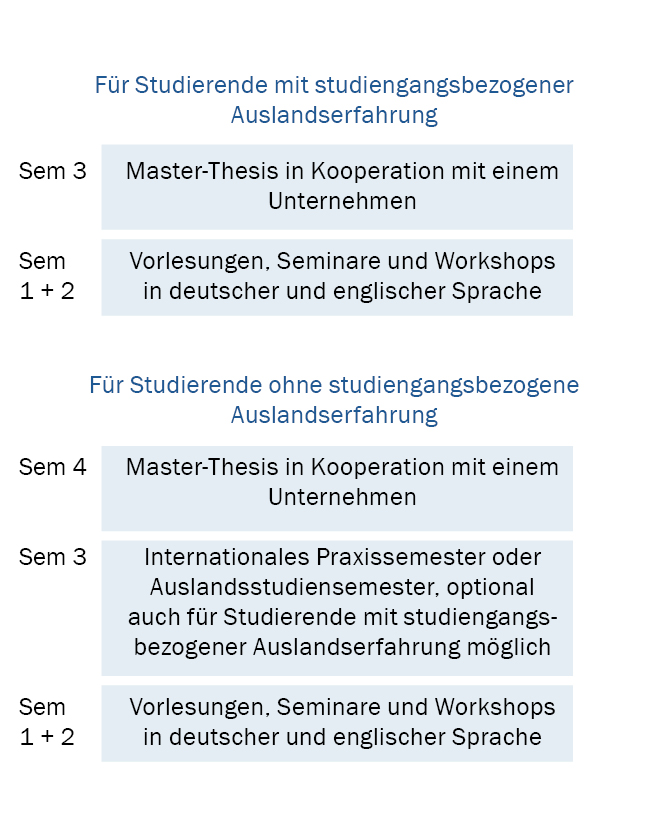 Wenn Sie vor der Aufnahme des Masterstudiums noch keine Auslandserfahrung gesammelt haben, absolvieren Sie im dritten Semester ein verpflichtendes Auslandsstudiensemester oder -praktikum. Mit dem Abschluss des Masterstudiums können Sie so qualifizierte internationale Erfahrung vorweisen. Studium verlängert sich dadurch um ein Semester.